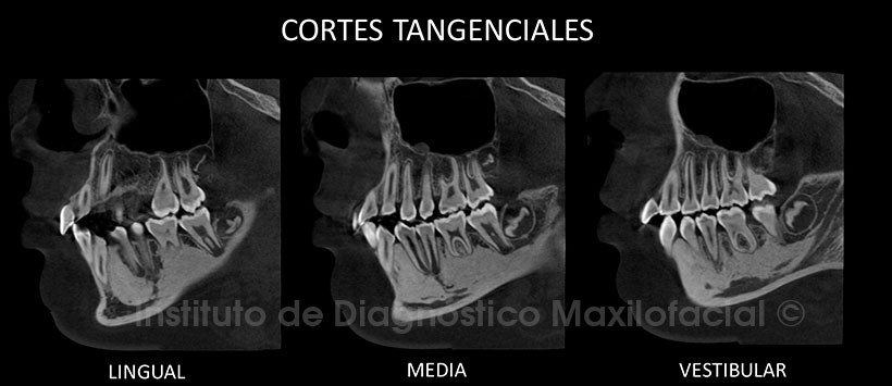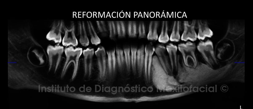 Mediante la evaluación de la tomografía volumétrica (CBCT), obtuvimos la reformación panorámica (Figura2) y los cortes tangenciales de dicha lesión (Figura 3) en la cual se observa su extensión, que abarca de distal de la pieza 33 hacia el germen de la pieza 38 sin comprometer es espacio del ligamento periodontal.
