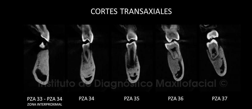 En los cortes axiales (Figura 4) se aprecia una mayor proximidad de la lesión hacia la tabla ósea lingual, siendo la zona parasinfisiaria donde dicha proximidad es equidistante hacia ambas tablas óseas. Además se observa a lo largo de los cortes transaxiales (Figura 5), la mimetización de la lesión con dichas tablas óseas lo cual indica una densidad elevada por parte de esta. Teniendo en cuenta que solo compromete a las estructuras óseas más no a las piezas dentarias.