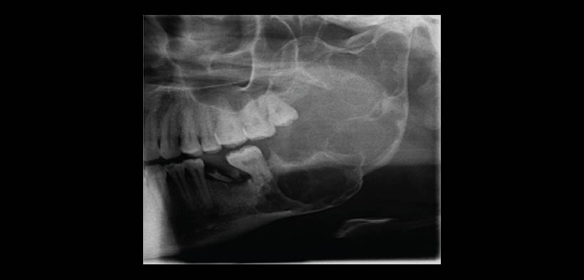 Fig. 1. Radiografía panorámica, muestra una lesión osteolitica bien delimitada localizada en el cuero, ángulo y rama mandibular izquierdo, se evidencia deformación de la apófisis coronoides.