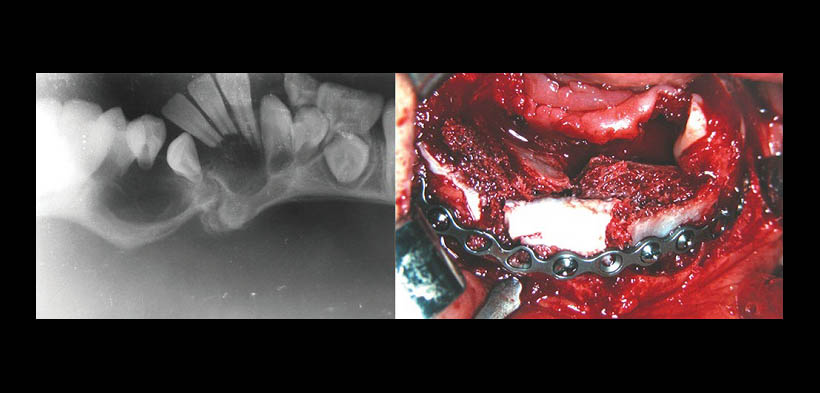 Fig. 2. Radiografía panorámica preoperatoria del caso anterior, que muestra le lesión osteolítica bien delimitada. La imagen adyacente muestra el procedimiento quirúrgico, en la que se evidencia la colocación de placas de titanio para la fijación mandibular.