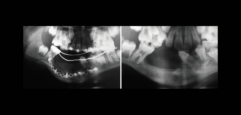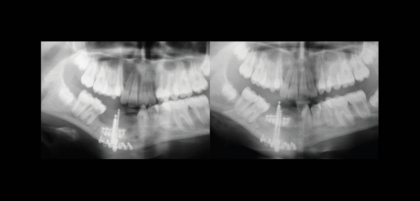Fig. 5. Radiografías panorámicas antes y después de la distracción osteogénica, en la imagen de la derecha se muestra un mayor aumento en las dimensiones de la altura del hueso alveolar (radiografía tomada a los 6 meses después de la distracción osteogénica)