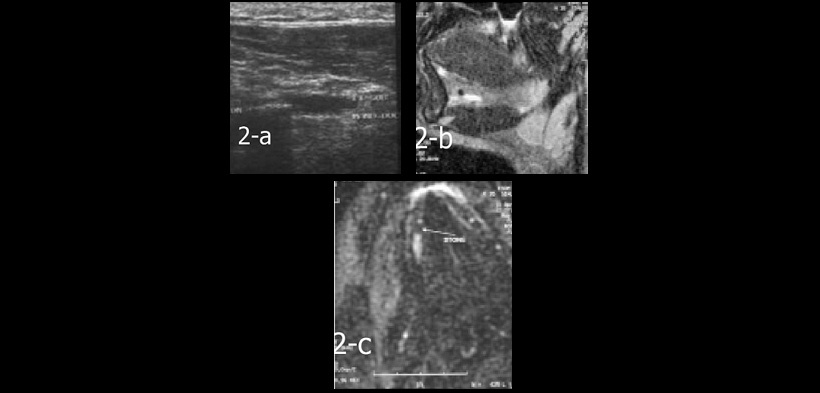 Fig. 2. a) Ecografía de la glándula submandibular derecha muestra un conducto dilatado y una imagen hiperecoica dentro de ella. La resonancia magnética del mismo caso muestra un conducto dilatado de la glándula submandibular derecha con presencia de un cálculo en su extremo, (b) vista sagital en T2, imagen ponderada muestra la presencia del cálculo. (c) sialograma RM, vista coronal muestra los mismos datos.