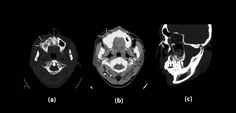 Fig. 1 Osteosarcoma en el maxilar derecho en un hombre de 29 años de edad. (a) TAC, vista axial muestra una gran masa destructiva osteoblástica (asteriscos negro) localizada a nivel del reborde alveolar posterior se extiende hacia el paladar duro y al seno maxilar, se evidencia también la reacción perióstica (flechas blancas). (b) TAC post-contraste, vista axial, se muestra aumento de volumen hacia los tejidos blandos (flechas blancas). (c) TAC, reformación multiplanar sagital, muestra una masa destructiva (asteriscos negros) se extiende hacia el paladar duro y el seno maxilar con calcificación osteoide (puntas de flecha negras)