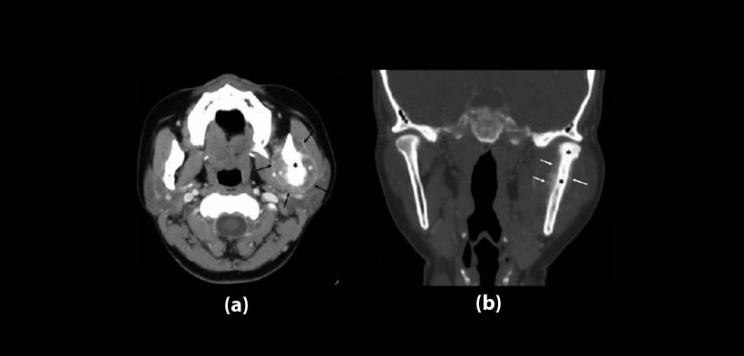 Fig. 2 Osteosarcoma en una mujer de 41 años de edad. (a) TC post-contraste, vista axial, muestra un masa osteoblástica de tejido tumoral (asterisco negro) a nivel de la rama mandibular izquierda con una extensión hacia los tejidos blandos (asteriscos blanco) y realce periférico (flechas negras). (b) TAC, reconstrucción multiplanar, vista coronal, muestra una alta densidad dentro de la cavidad medular de la rama izquierda mandibular y del cóndilo (asteriscos negro) en comparación con el lado opuesto, se evidencia también la reacción perióstica (flechas blancas)