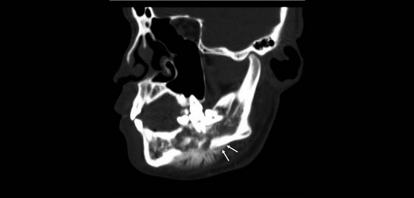 Fig. 3 Osteosarcoma a nivel del cuerpo mandibular en un hombre de 18 años de edad. TAC, la reconstrucción multiplanar en la vista sagital, muestra mostrar una reacción perióstica clásica en “rayos de sol” (flechas blancas)