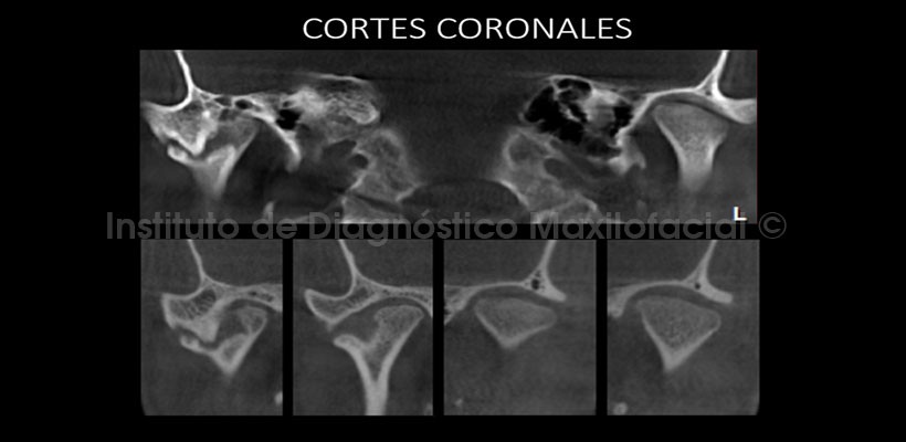 La tomografía computarizada de haz cónico, mediante los cortes sagitales, muestra de manera más clara la alteración de la morfología de la cavidad glenoidea, del cóndilo y del cuello del cóndilo. A nivel del cóndilo se observa que la mencionada alteración es dependiente de los contornos anterior, superior y posterior (Fig. 2).  En la misma zona, mediante los cortes coronales, se aprecia la pérdida de la concavidad y el aumento del grosor de la cortical de la cavidad glenoidea; así como, el compromiso del contorno lateral del cóndilo (Fig. 3). Signos imagenológicos compatibles con una Anquílosis Fibrosa Unilateral.