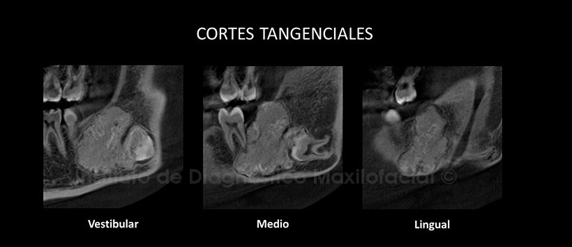 En los cortes axiales de maxilar inferior, pudimos observar el aumento de tamaño de la tabla ósea lingual y vestibular, siendo esta ultima la de mayor predominio (Figura 2). Así mismo en los cortes transaxiales y tangenciales podemos observar la estrecha relación de esta lesión con los ápices de la pieza 37, también se aprecia el adelgazamiento de a cortical lingual a causa de esta lesión y el desplazamiento hacia caudal del conducto dentario inferior. (Figura 3 y Figura 4)