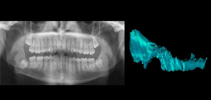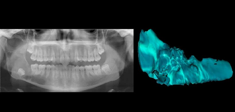 Fig 1. Radiografía panorámica y reconstrucción 3 D del volumen de la lesión, en un paciente con probable diagnóstico de tumor odontogénico queratoquístico que se va a someter a una descompresión quirúrgica.