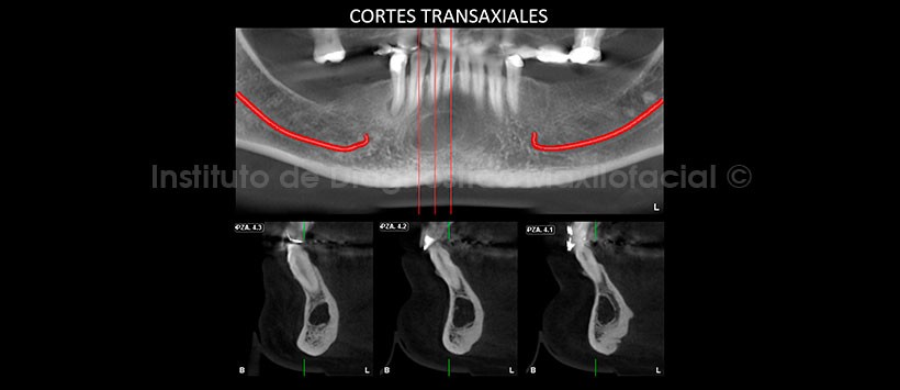 La tomografía computarizada de haz cónico, mediante los cortes transaxiales y tangenciales, nos muestra la presencia de una imagen isodensa en la región antes mencionada, la cual no compromete los segmentos radiculares de las piezas vecinas ni tampoco las tablas óseas bucal y lingual. Signos imagenológicos compatibles con una entidad benigna, descartar Quiste Óseo Traumático (Fig. 2 y 3).