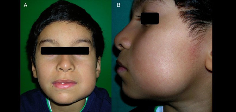 Fig 1. Características clínicas del fibroma osificante juvenil en un niño de 9 años de edad con diagnóstico histopatológico. A) Gran asimetría facial a expensas del cuerpo y de la rama mandibular izquierdo. B) Aumento de volumen recubierto por piel de características normales.