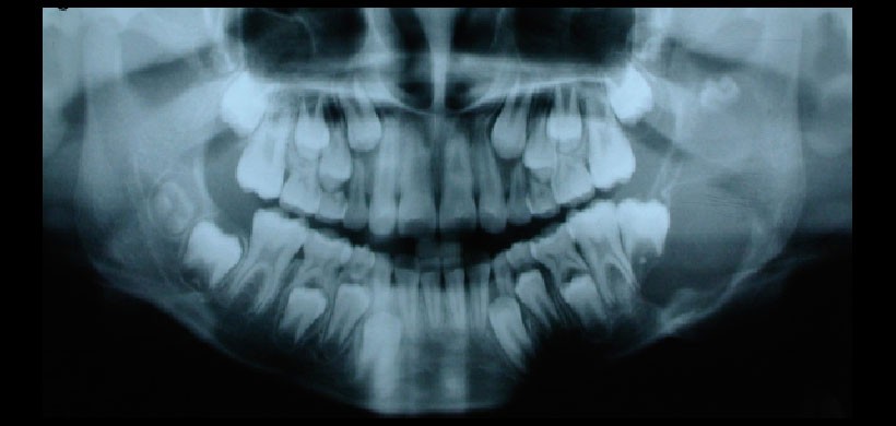 Fig 2. Radiografía panorámica del caso anterior. Se visualiza una extensa lesión radiolúcida de contenido, comprometiendo el cuerpo y la rama mandibular izquierda y produce el desplazamiento del germen del tercer molar inferior