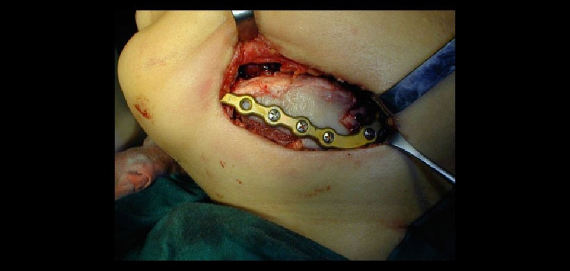 Fig 3. Abordaje submandibular. Colocación de injerto costocondral y de la cresta ilíaca en posición, fijación mediante placas y tornillos de titanio.
