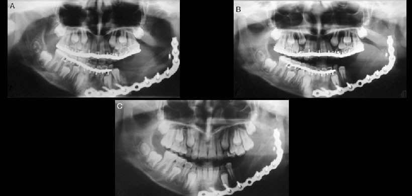 Fig 4. Controles radiográficos. A) Control de una semana postintervención. B) Control de 3 meses. Nótese la remodelación del segmento condilar del injerto costocondral. C) Control de 6 meses. Se observa una franca remodelación del segmento condilar y una formación de proceso coronoideo.