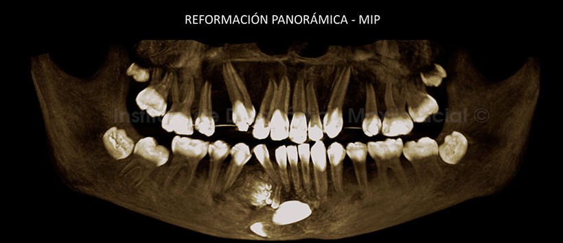 Se obtuvo una reformación panorámica de la reconstrucción multiplanar (Figura1) y en Proyección de Máxima Intensidad – MIP (Figura 2), siendo lo más resaltante la presencia de un odontoma compuesto, la pieza 43 retenida y un diente supernumerario.
