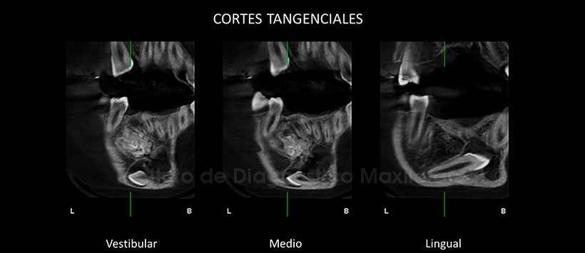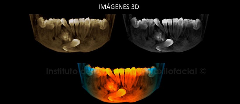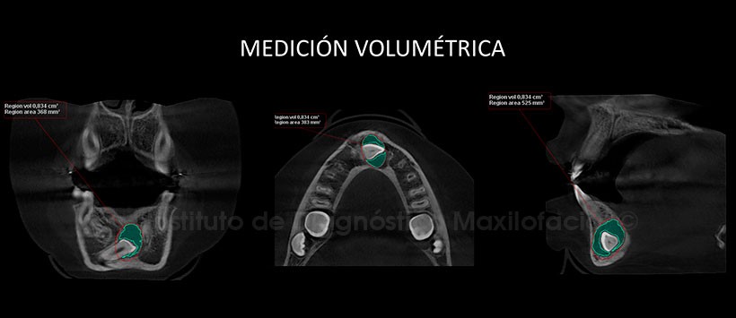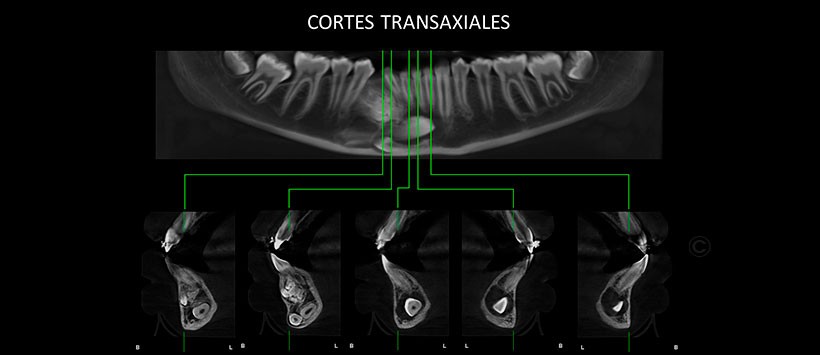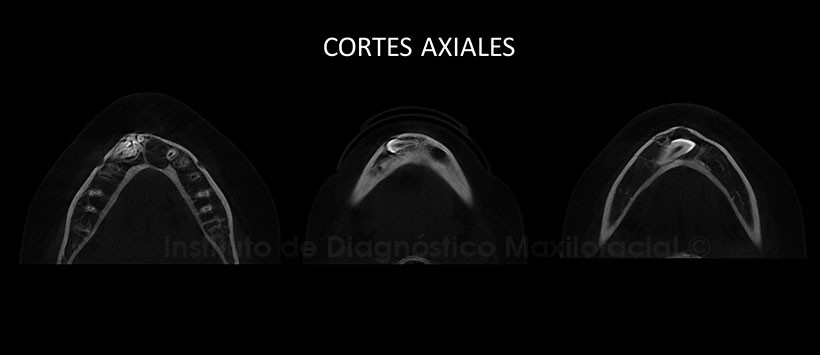 Mediante los cortes axiales (Figura 3) podemos observar estas tres entidades juntas en sínfisis mandibular. Así mismo se puede apreciar un ensanchamiento del espacio folicular de limites definidos, bordes corticalizados que se origina del segmento coronario de la pieza 43 (Figura 4), de aproximadamente 0.8 mm3 compatible con probable quiste dentígero.