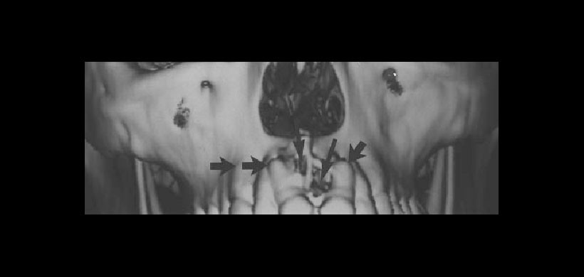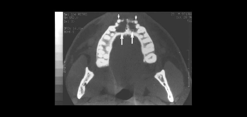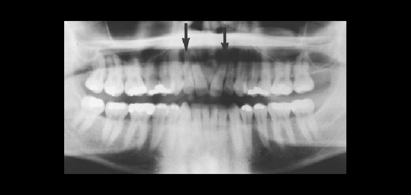 Fig 1. Radiografía panorámica de un hombre de 29 años de edad, con un aumento de volumen en la región anterior del maxilar, se observa una imagen radiolúcida de limites pocos definidos que ocasiona la divergencia de las raíces de los incisivos centrales superiores(flechas),