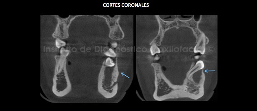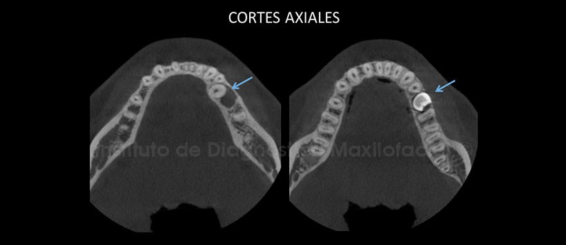 Al estudio mediante tomografía computarizada de haz cónico (CBCT) en cortes axiales (Figura 2) y coronales (Figura 3) se evidencia que la imagen antes descrita expande ligeramente la tabla tablas ósea vestibular y desplaza a la pieza 3.5 hacia lingual (a nivel del tercio medio radicular). El tercio apical presenta dilaceracion hacia caudal y la porción coronal se encuentra hacia la tabla vestibular