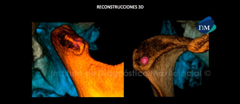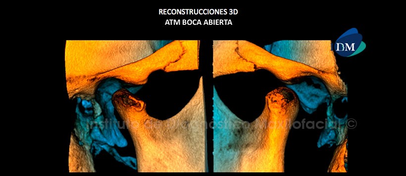 En las reconstrucciones 3D se observa la alteración en la anatomía y morfología condilar en ambos lados, la presencia de osteofito y del quiste subcondral a nivel de la ATM del lado derecho (Figura 5 y 6). Además se aprecia la hipomovilidad articular en ambos lados (Figura 7)