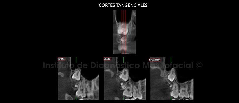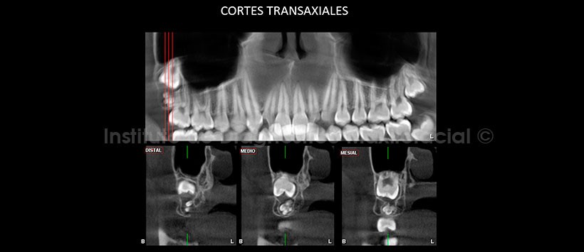 La tomografía computarizada de haz cónico mediante los cortes transaxiales nos muestra claramente que el Odontoma se encuentra equidistante a ambas tablas óseas. Por otro lado, los cortes tangenciales evidencian la proximidad de la lesión a la raíz de la pieza 17 y a la cortical folicular de la pieza 18. (Fig. 2 y 3).