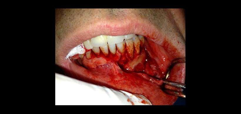 Fig 3.Cirugía exploratoria  que muestra el tejido blando lobular que es completamente diferente de un epitelio quística que cubre toda la radiotransparencia dejando a los ápices de los dientes intactos.