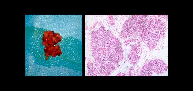 Fig 4. La biopsia confirmo el contenido glandular del defecto óseo.