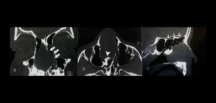 Figura 1: Tomografía computarizada de un mucocele de fosas nasales: A, corte coronal, B corte axial y C, corte sagital