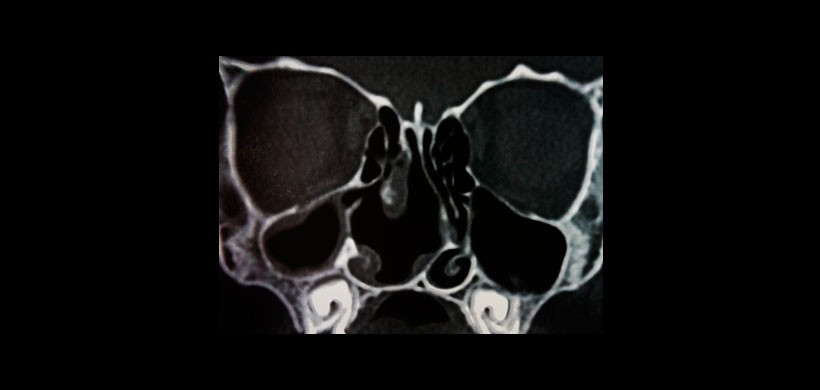 Posterior al examen clínico se realizó una tomografía computarizada de alta resolución, la cual mostró una lesión isodenza de limites definidos, al parecer originarios de la región del cornete medio y era compatible con un mucocele de cornete medio