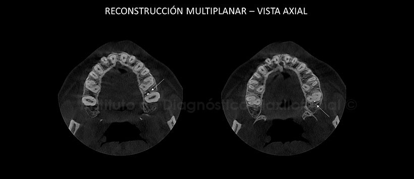 A la evaluación tomográfica, se optó primero por realizar una reformación panorámica (Opción MIP) en la cual se evidencia con mayor claridad las estructuras previamente mencionadas. En los cortes axiales y tangenciales de la pieza 27, apreciamos la verdadera ubicación de estas estructuras, así mismo notamos que la densidad es muy similar a la densidad del esmalte dentario. (Figura 2, Figura 3 y Figura 4)