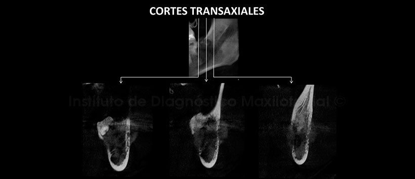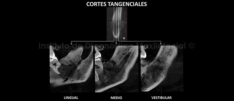 A la evaluación de la tomografía volumétrica (CBCT) en cortes axiales (Figura 2), transaxiales (Figura 3) y tangenciales (Figura 4), se evidencia destrucción ósea localizada a nivel del reborde alveolar correspondiente a las pieas 3.7, 3.8 con las siguientes características: Bordes mal definidos, límites difusos, compromete corticales óseas tanto del conducto dentario inferior como de las piezas involucradas, erosiona la tabla ósea vestibular y lingual, así mismo se aprecia reacción periostal en apariencia de “rayos de sol” a predominio de la tabla ósea vestibular. Imágenes sugerentes de NM