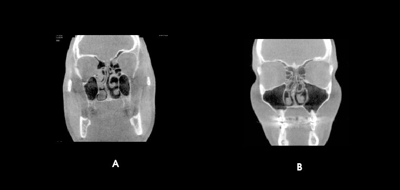 Fig 1. A, B. Variaciones del cornete medio, A) cornete medio invertido, con una desviación del tabique nasal hacia la derecha. B) cornete medio neumatizado bilateral asociado a desviación del tabique nasal hacia la derecha.