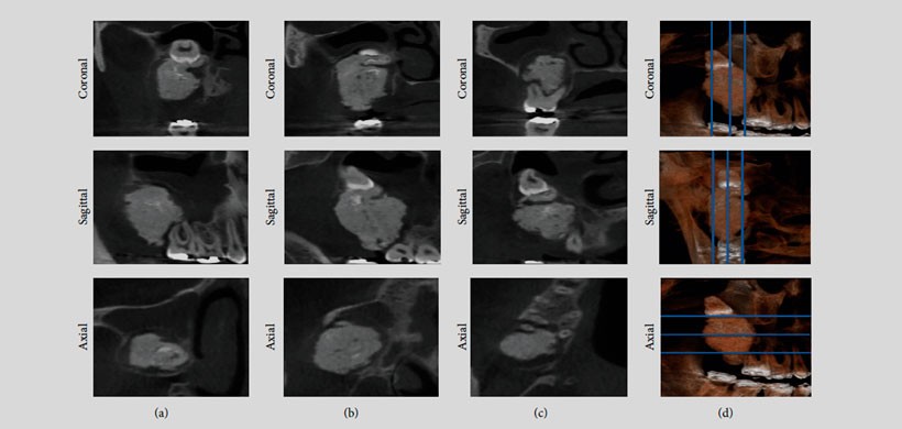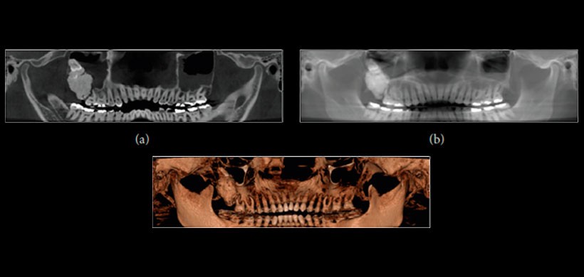 El presente reporte es un paciente de sexo masculino que fue remitido al Departamento de Cirugía Oral y Maxilofacial, Universidad de Montes Claros, con la principal queja de dolor en la región posterior de la maxilar derecho. Las reformaciones panorámicas y los cortes obtenidos de la CBCT mostraron una masa radiopaca irregular rodeada por una distinta llanta radiolúcida asociada con el tercer molar superior derecho, en estrecha relación con el seno maxilar. (Figura 1 y Figura 2) Posterior a la cirugía, se realizó un escaneo de micro – CT de la muestra obtenida y se obtuvo la adquisición usando una máquina SkyScan 1172 (Bruker SkyScan , Aartselaar , Bélgica ). En la cual se observó material en la periferia de la lesión ( Figuras 3 ( b) y 3 ( c) , flechas blancas ), que es compatible con esmalte de los dientes y áreas hipodensas (Figuras 3 (b) y 3 (C), flechas negras) compatibles con el tejido de la pulpa siendo el diagnóstico definitivo de odontoma complejo .
