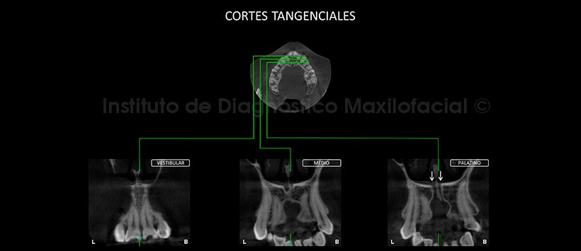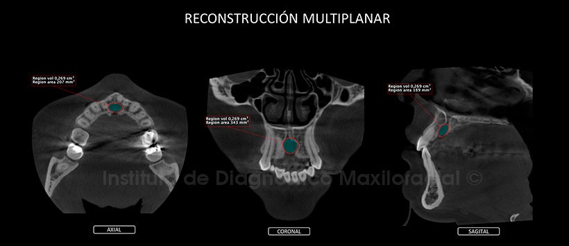 A la evaluación tomográfica se pudo determinar el aumento de tamaño y volumen del conducto nasopalatino, con una medida volumétrica aproximada de 0.2 cm(Figura 2).  Así mismo en los cortes transaxiales se observa que este aumento de tamaño todavía no afecta a las piezas dentarias adyacentes sin embargo existe un  desplsamaiento predominante de la tabla ósea vestibular del conducto nasopalatino (Figura 3). En los cortes tangenciales se aprecia que la extensión en un sentido mesiodistal, la cual se extiende hasta los segmentos radiculares de las piezas 12 y 22, así mismo se puede apreciar una variación anatómica en el trayecto del conducto, existiendo dos conductos laterales que convergen en un mismo conducto (Figura 4).