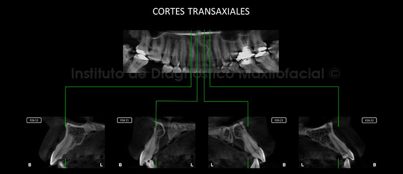A la evaluación panorámica (ortopantomografia), se aprecia  un aplanamiento del contorno de cóndilo mandibular derecho, neumatizacion alveolar de ambos senos maxilares así como la presencia de múltiples restauraciones, ausencias de piezas dentarias y lesiones cariosas en algunas piezas. Sin embargo lo más resaltante es la presencia de una imagen radiolúcida de límites parcialmente definidos y un borde parcialmente corticalizado proyectado en el segmento radicular de la pieza 12 y 22 (Figura 1). Motivo por el cual se optó por ampliar el estudio mediante el uso de la tomografía volumétrica.