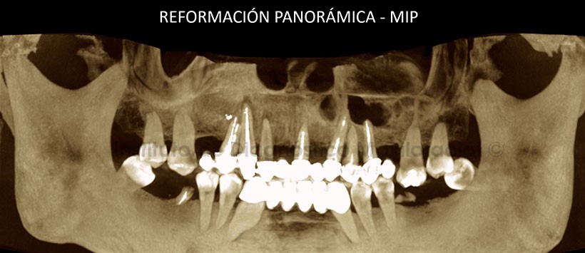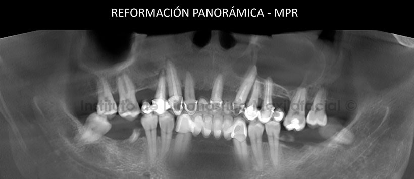 A la evaluación tomográfica se pudo obtener una reformación panorámica en “Proyección de Máxima Intensidad – MIP” (Figura 1) así como una reformación en “Reconstrucción Multiplanar – RMP” (Figura 2) en las cuales se aprecia una imagen isodenza en el maxilar superior a nivel del cuadrante dos.