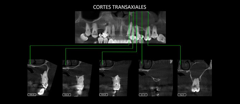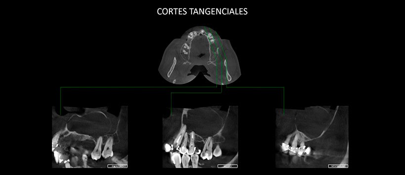 En los cortes transaxiales  (Figura 4) y tangensiales (Figura 5), podemos apreciar  que esta lesión se extiende desde mesilla de  la pieza 23 hasta mesilla de la pieza 28, siendo las piezas 23, 24, 25 y 27 las que están comprometidas con esta lesión al perder la lámina dura en zona periapical y presentando una reabsorción radicular externa muy leve en el tercio apical. También se puede apreciar un engrosamiento de la mucosa de seno maxilar adyacente a la lesión y una expansión de la tabla ósea palatina y parte del paladar duro de ese mismo lado.