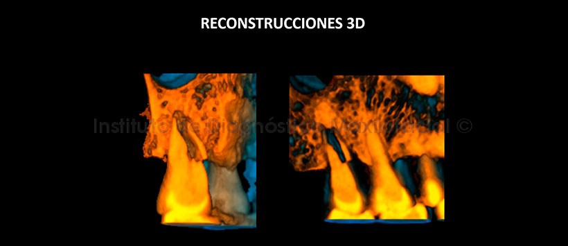 En las reconstrucciones 3D (Figuras 4 y 5) se aprecia con claridad el trazo de fractura radicular desplazado y la severa pérdida ósea circundante.