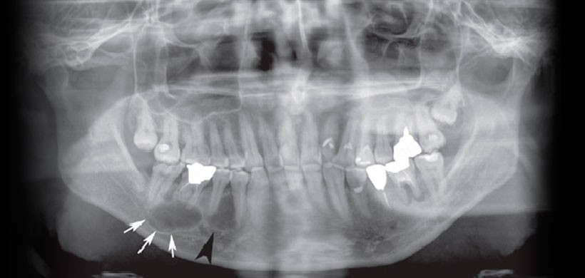 Fig 1. Radiografía panorámica inicial demuestra la presencia de dos lesiones radiolúcidas. Se identificó una lesión alrededor del ápice de la raíz del primer molar inferior derecho (flechas blancas) y se observó otra lesión en el septo interalveolar de los premolares inferior derecho (punta de flecha negra). Los diagnósticos de imagen de las dos lesiones fueron un quiste radicular y un quiste óseo simple, respectivamente.