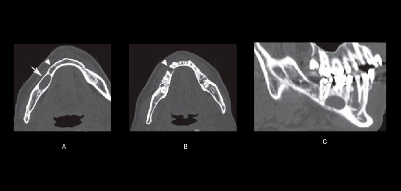 Fig 2. Imágenes de tomografía computarizada de la mandíbula del paciente. (A) Una vista axial que muestra la sección transversal de la mandíbula desde el lado derecho del paciente. Se detectó una lesión quística de 15 mm de tamaño redondo y bien definida en el ápice de la raíz del primer molar inferior derecho (flecha); Además, se identificó una lesión radiolúcida de 12 mm de tamaño en el tabique interalveolar de los premolares inferiores (punta de flecha). (B) Una vista axial demostró la divergencia radicular de los premolares inferior derecho (punta de flecha). (C) Una vista para-sagital reveló el septo dentro del ameloblastoma, así como la divergencia de los premolares inferior derecho.