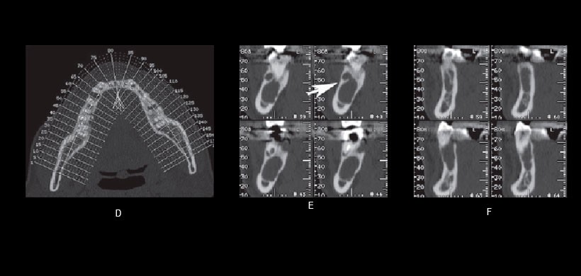 Fig 3. Imágenes de tomografía computarizada de la mandíbula del paciente. (D) Imagen de referencia de la reconstrucción ortogonal. Los números asignados son equivalentes al número de imagen de cada vista ortogonal. (E) Las vistas ortogonales que representan el tumor odontogénico queratoquístico revelaron el tabique dentro del KCOT (flechas). (F) Vistas ortogonales que identifican el ameloblastoma.