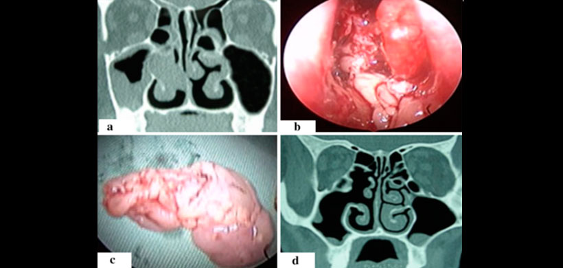 Figura 1: a) TC de senos paranasales,  b) Visualización de la lesión mediante el uso de endoscopio, c) Retiro del tumor d) TC posoperatorio