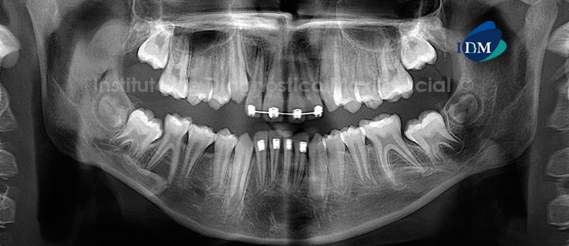 A la evaluación de la radiografía panorámica (Figura 1), se aprecia aparatología fija para ortodoncia en sector dentario anterior, las segundas molares en proceso de erupción y los gérmenes dentarios de las terceras molares en evolución intraósea, teniendo en consideración que los gérmenes de las piezas 18 y 28 presentan una anomalía dentaria respecto al tamaño (microdiente).