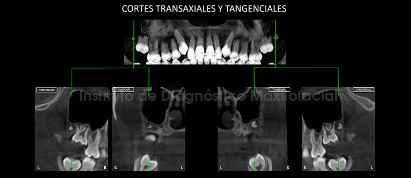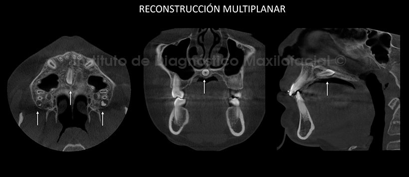 A la evaluación tomográfica, se pudo confirmar la presencia de estos microdientes (Figura 2). Sin embargo en la reconstrucción multiplanar (vista axial, coronal y sagital) se pudo observar la presencia de diente supernumerario localizada a nivel del paladar (próximo a la sutura intermaxilar) (Figura 3). En los cortes transaxiales y tangenciales se pudo localizar de manera exacta a los folículos de las piezas 18 y 28, las cuales están localizadas próxima a la tabla ósea vestibular (Figura 4).