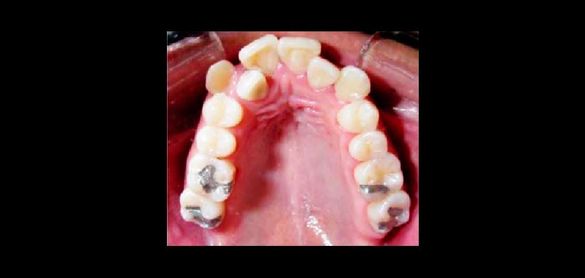 Figura 1: Arco superior, forma de arcada triangular, Incisivos laterales palatinizados, canino izquierdo fuera de arco. Apiñamiento severo.