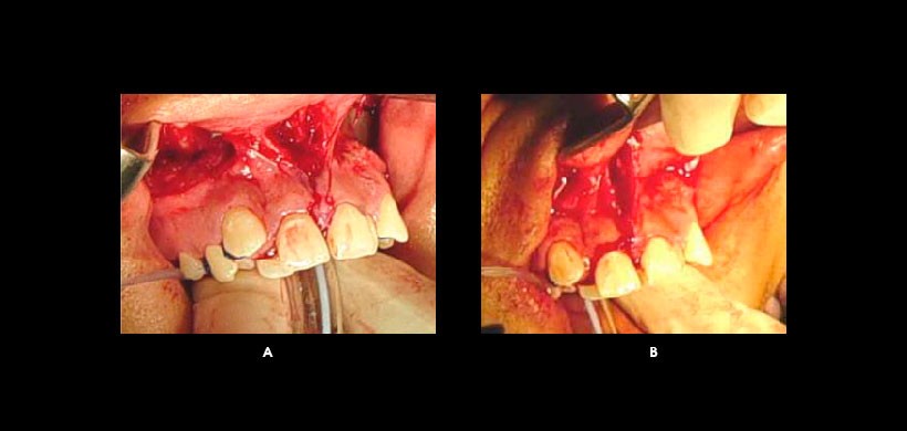 Figura 2: A) La incisión se realiza por encima de los ápices de los incisivos en dirección de la espina nasal anterior. B) Separación del septo nasal; se realiza una osteotomía vertical, utilizando cincel.