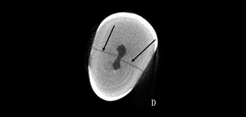 Para medir y registrar la profundidad de a grieta, se utilizó la microtomgrafia computarizada (miicro-CT), considerada como un examen relativamente más preciso que otros. La observaciones fueron realizadas por tres observadores, un estudiante graduado de endodoncia, un endodoncista y un radiólogo experimentado respectivamente, examinaron los resultados de PR y CBCT independientemente, y la presencia o ausencia de fisuras respectivamente. (Figura 2)