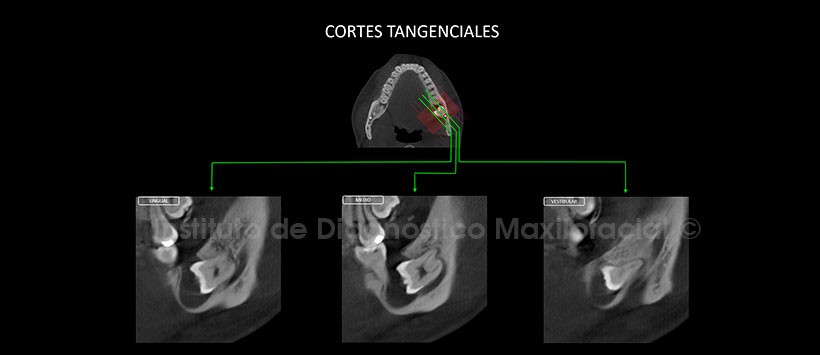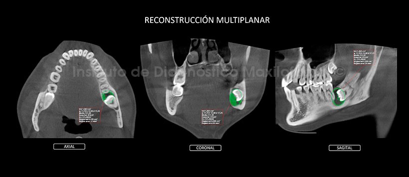 A la evaluación mediante la tomografía volumétrica de haz cónico se determinó mediante la reconstrucción multiplanar que esta lesión tiene un volumen de 1.2 cm3 (Figura 2) así mismo en los cortes transaxiales y tangenciales se aprecia un desplazamiento de la tabla ósea lingual, borramiento parcial de la lámina dura de la raíz distal de la pieza 37 y de la cortical superior del conducto dentario inferior a nivel coronario de la pieza 38 (Figura 3 y Figura 4). También cabe mencionar que esta entidad se origina en la unión cementoadamantina de la pieza a la cual está asociada, siendo este dato de suma importancia ya que nos permite tener un diagnóstico más preciso.