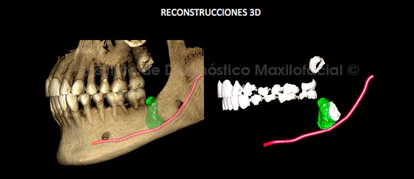 En las reconstrucciones tridimensionales se puede apreciar esta lesión y su repercusión en los tejidos óseos y dentarios adyacentes, obteniendo un punto de vista vestibular así como lingual (Figura 5 y Figura 6).