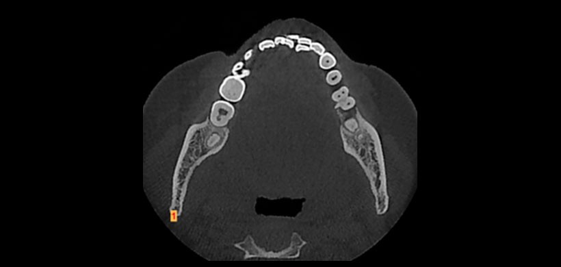 Al realizarse la tomografía computarizada de haz cónico detectó una una estructura de densidad dentaria en el área de furcación con una forma esferoide alargada de 1,8 mm de ancho y 8 mm de largo. (Figura 2)