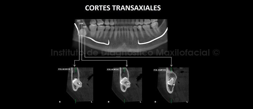 A la evaluación de la radiografía Panorámica (Figura 1) se apreció la impactación de la pieza 48, en posición transversal y con ligera orientación mesioangular, con el segmento cervical y medio radicular en estrecha relación con el conducto dentario inferior adyacente. A la evaluación de la tomografía computarizada Cone beam mediante cortes axiales, coronales, sagitales (Figura 2) y transaxiales (Figura 3), se encontró la disposición de la pieza 48 incluida, en posición transversal, con el segmento radicular orientado hacia la tabla ósea lingual, ocasionando la conformación de la cara lingual al contorno radicular y disminución parcial del espacio periodontal y folicular. Se evidenció la disposición del conducto dentario inferior en relación directa con la pieza 48, mostrando un recorrido de mesial a distal orientado hacia la tabla ósea lingual e interradicular con respecto a dicha pieza.