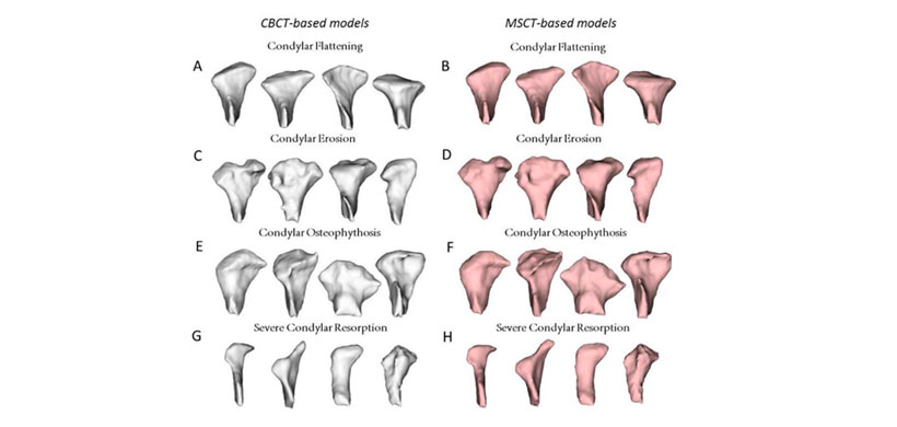 Aunque se ha demostrado que la CBCT proporciona nuevos datos de investigación 3D y clínicamente son relevantes para el diagnóstico y planificación del tratamiento, su validez como herramienta fiable comparada con los datos del MSCT siguen siendo cuestionables. Los cirujanos han preferido a menudo datos MSCT para producir modelos esterolitográficos anatómicamente precisos de la mandíbula y la articulación temporomandibular. Es por ello que el objetivo del presente estudio fue comparar cuantitativamente la morfología condilar usando la tomografía volumétrica de haz cónico (CBCT) y la tomografía espiral multicorte (MSCT).